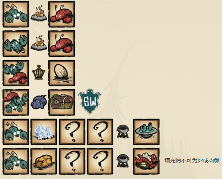 在龙虾还活着的时候它们可以被放入烹饪锅中,右键点击则可以杀死放置在物品栏里的活龙虾。死掉的龙虾只能被生吃或者烤熟而不能放入烹饪锅中。