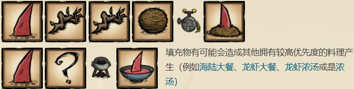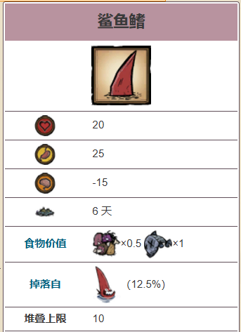 鲨鱼鳍(Shark Fins)是船难DLC中新增的食物。它会从海猎犬身上掉落,也可以借由与海盗章鱼交易取得(几率低)。鲨鱼鳍无法煮熟,但是可以在烹饪锅中使用,且具有 0.5 点的肉类系数及 1 点鱼类系数。它们不会因为放置在地上就被贪吃的生物捡来吃掉,也无法拿来喂食野猪。它们也不能拿给海盗章鱼。