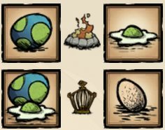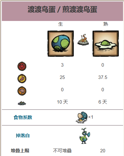 煎渡渡鸟蛋(Fried Doydoy Egg)是把渡渡鸟蛋放置在营火、火坑、黑曜石火坑、防风火炉或火焰间歇泉上烤熟后获得的食物。