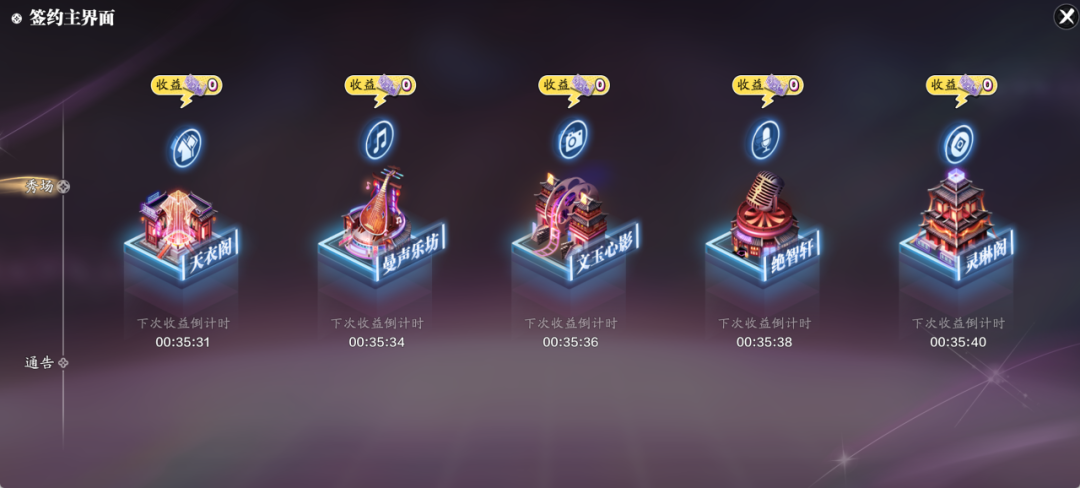 通告多多,收益多多。天衣阁、曼声乐坊、文玉心影、绝智轩、灵琳阁分别向旗下艺人抛来橄榄枝,选择适合的艺人签约获取收益吧!