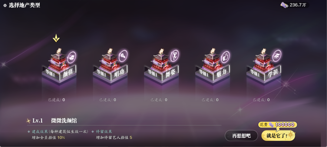 艺人颜值不够?少侠不必焦虑,来微微洗颜馆“洗洗看”,提升艺人颜值;好的艺人当然是唱跳俱佳,唱功和舞姿就交给人生当歌厅和武舞合一局,包会的;能力出众也需要观众的认可,魅力也是至关重要,魅力提升营让你的艺人路人缘up up↑;最后,艺人只有好看的皮囊是不够的,到正经藏书院给艺人内在包装,富有学识才能让星途坦荡!