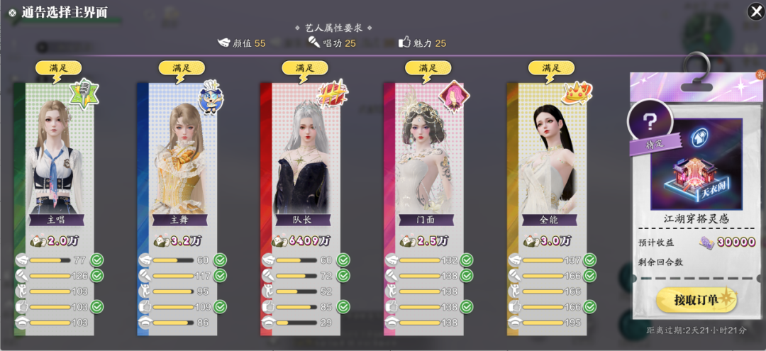 作为一名成熟的经纪人,甲方的要求是一定要满足的。收到通告订单,请少侠根据订单要求安排符合的艺人接取通告。