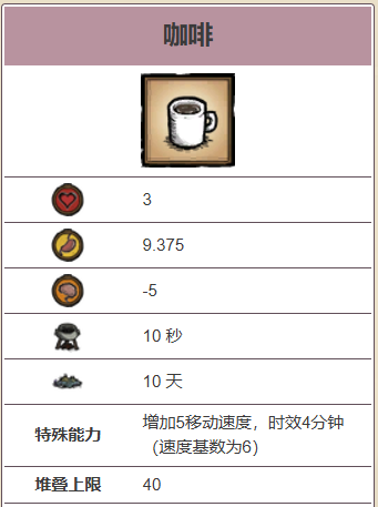 玩家在喝下咖啡后会获得长达半天(4分钟)的速度+5效果,对于拥有6基础速度的普通角色来说,这相当于增加了83%的移动速度。