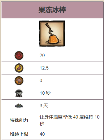 它能够回复 20 点生命值、12.5 点饥饿值,且能够让身体温度降低 40 度维持 10 秒。果冻冰棒和香蕉冰棒很类似。
