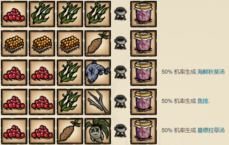 使用一根树枝作为填充物可能会生成鱼排,加入玉米则可能生成鱼塔可,加入鱼则可能生成海鲜秋葵汤。
