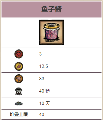 鱼子酱需要 40 秒烹饪,食用时回复 3 点生命值、12.5 点饥饿值和 33 点理智值。它不能用来和海盗章鱼交易。