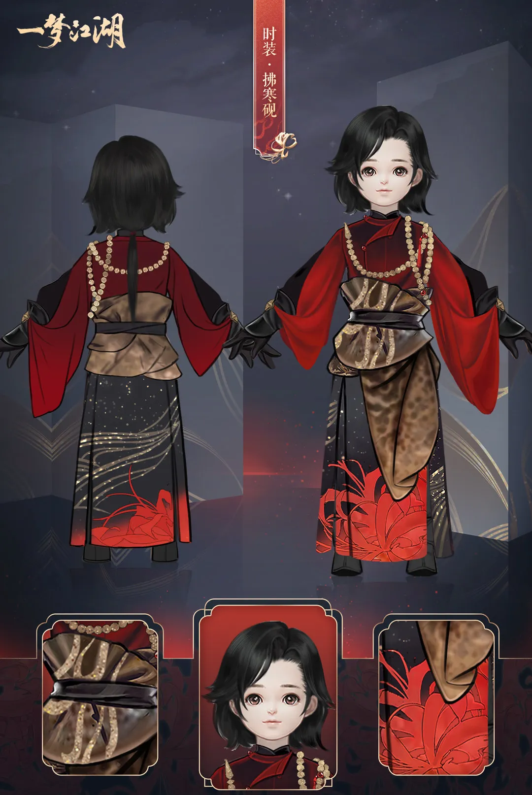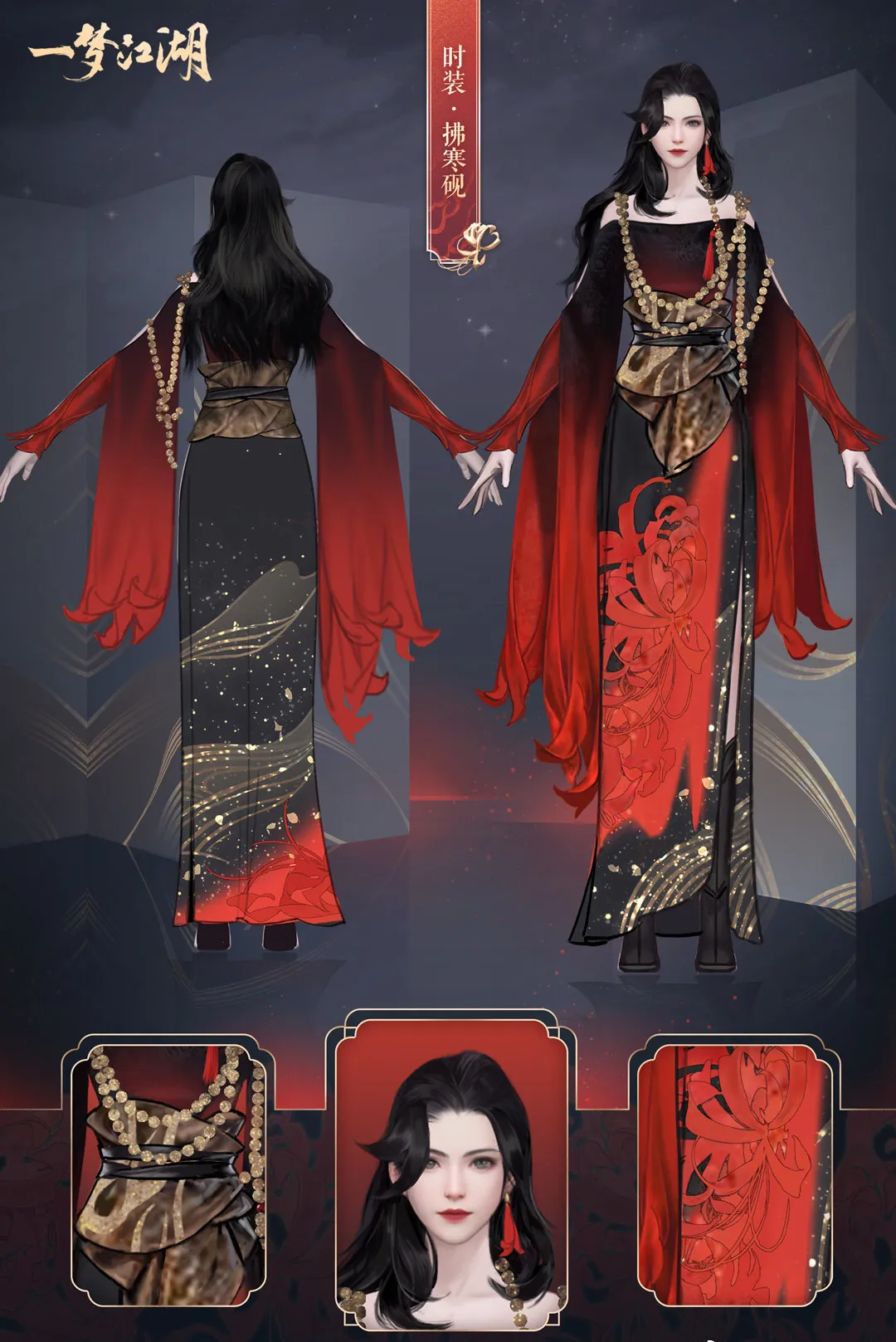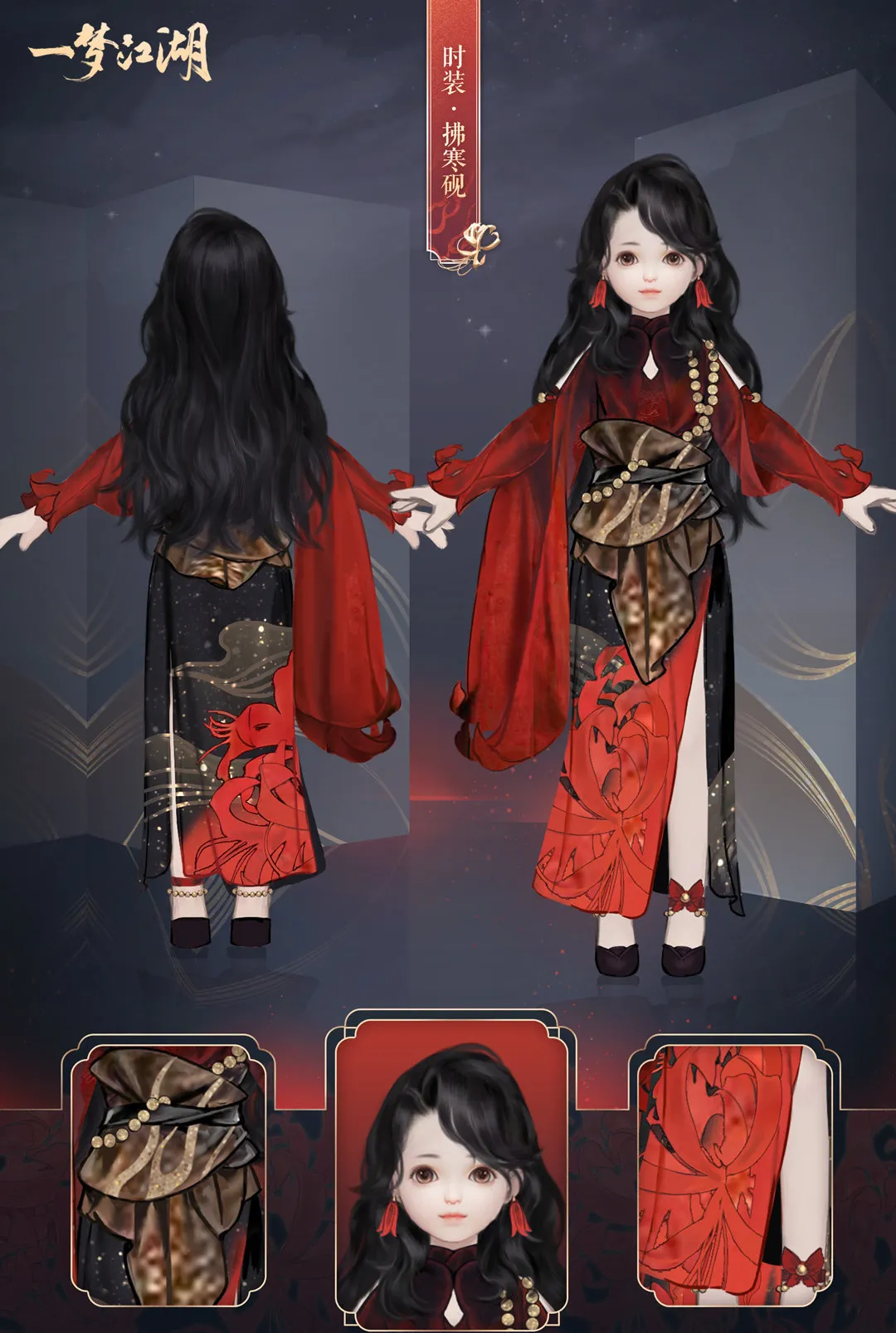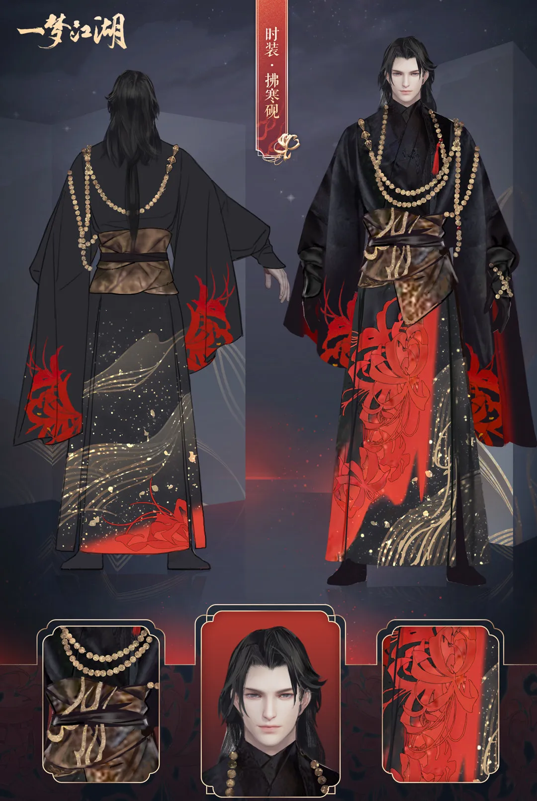 时装·拂寒砚采用了彼岸花作为主要设计元素,四个体型的裙摆上都有着大片的彼岸花点缀,上身黑如夜空,穿上这套衣服,仿佛在夜色中踏着彼岸花丛走来。
