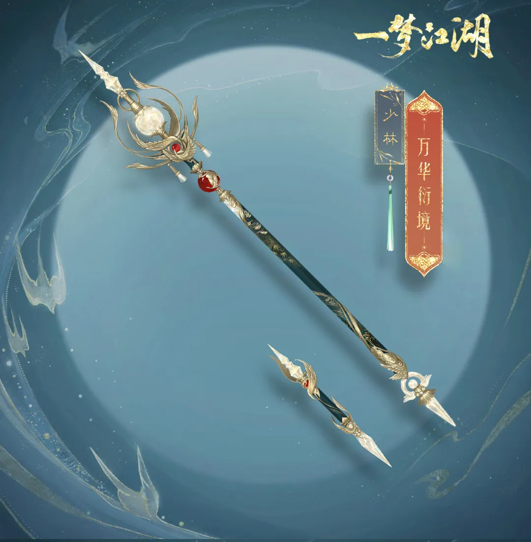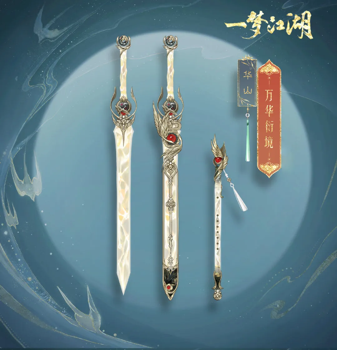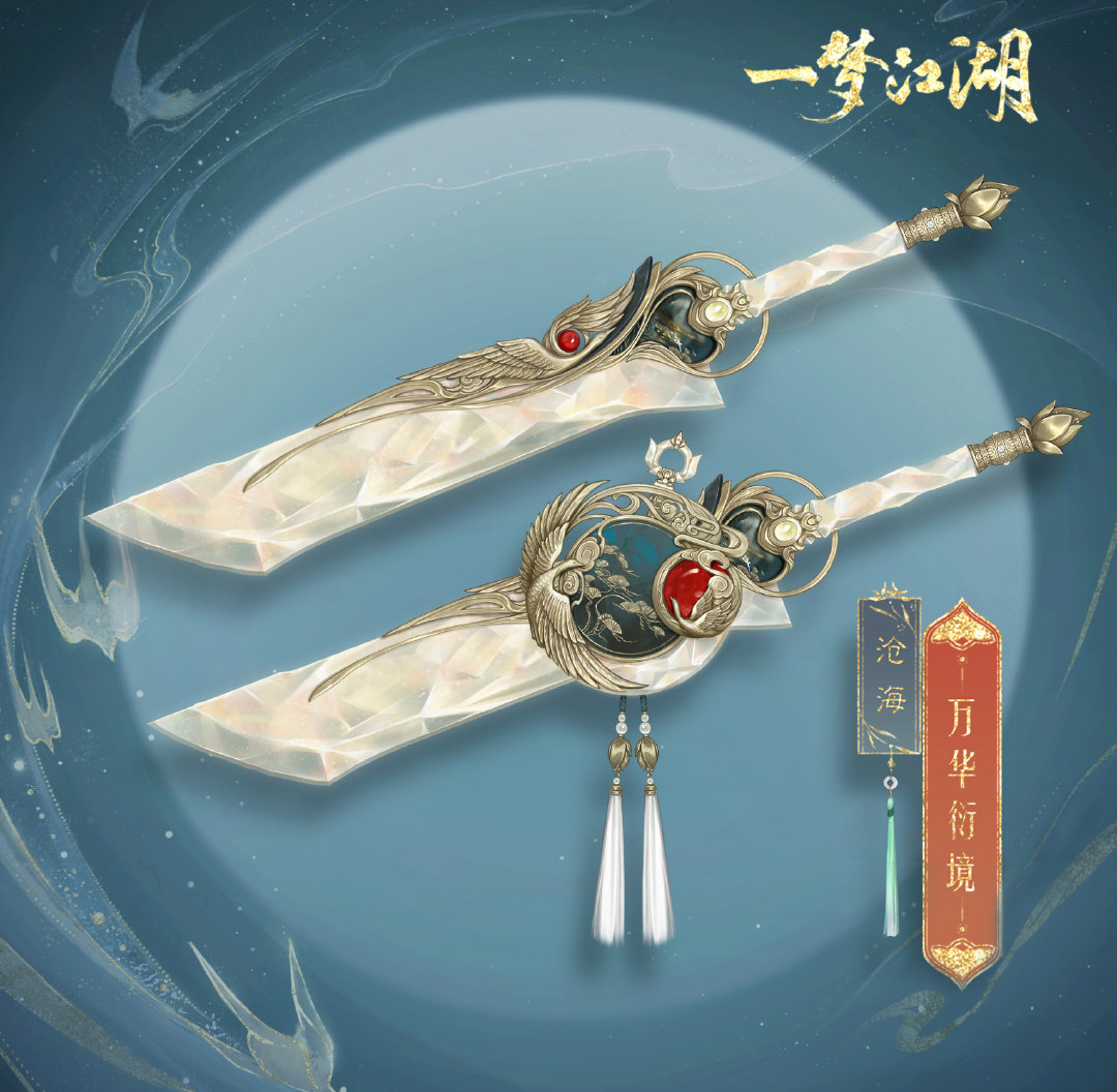 沧海弟子群星为引,长刀相随,流光溢彩的刀身灿若星斗,刀背上飞舞的仙鹤抱着一颗红宝石,与万华衍境·垣上的纹样相映成趣,挂着小巧花苞的流苏悬下,霸气中增添了几分灵动与可爱。