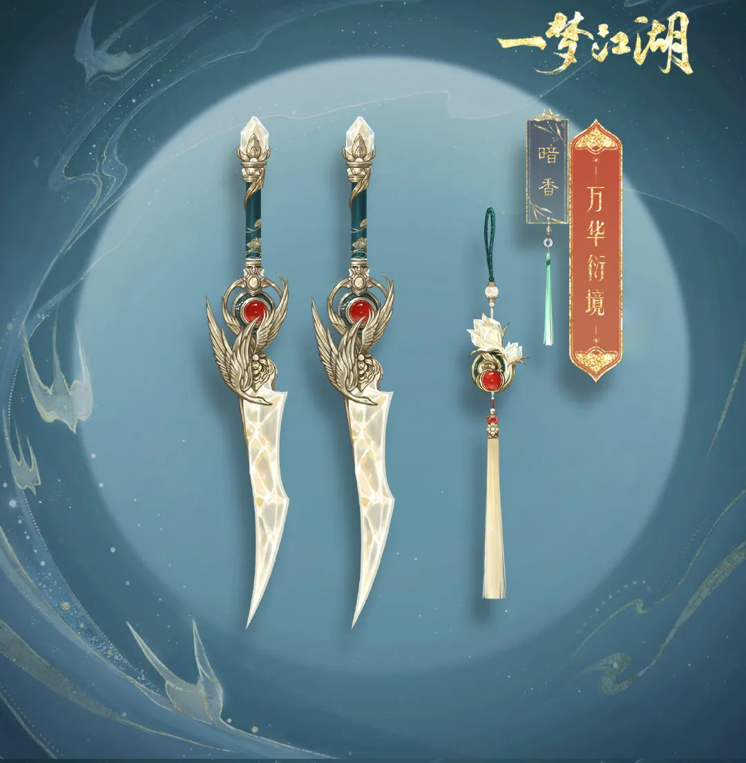 暗香弟子的匕首藏于袖间,小巧精致,钻石匕刃有着漂亮的弧度,削铁如泥,用于反手出招的墨绿色柄尾也镶着尖锐的钻石,随身携带的香囊上雕了一朵浪漫的钻石小花,行于黑暗的冷酷杀手危险又美丽。