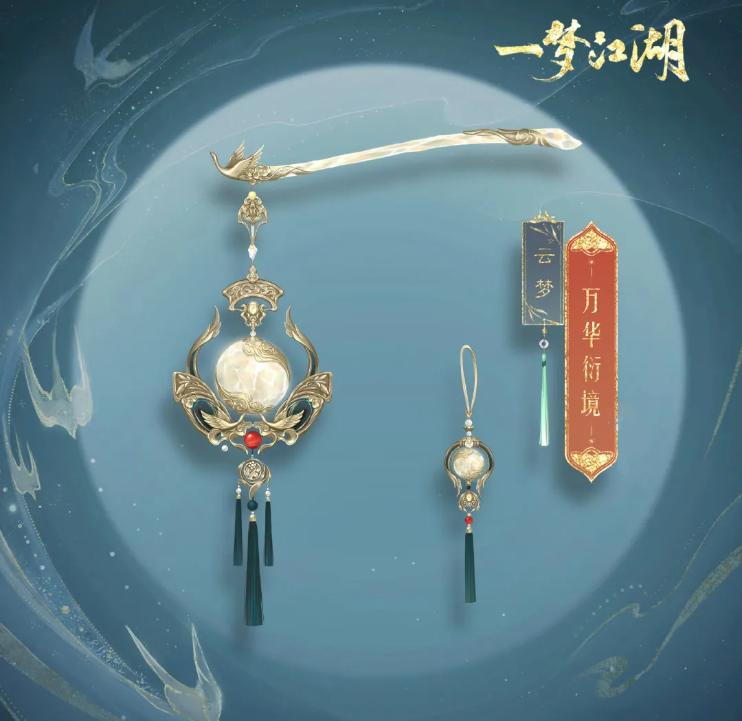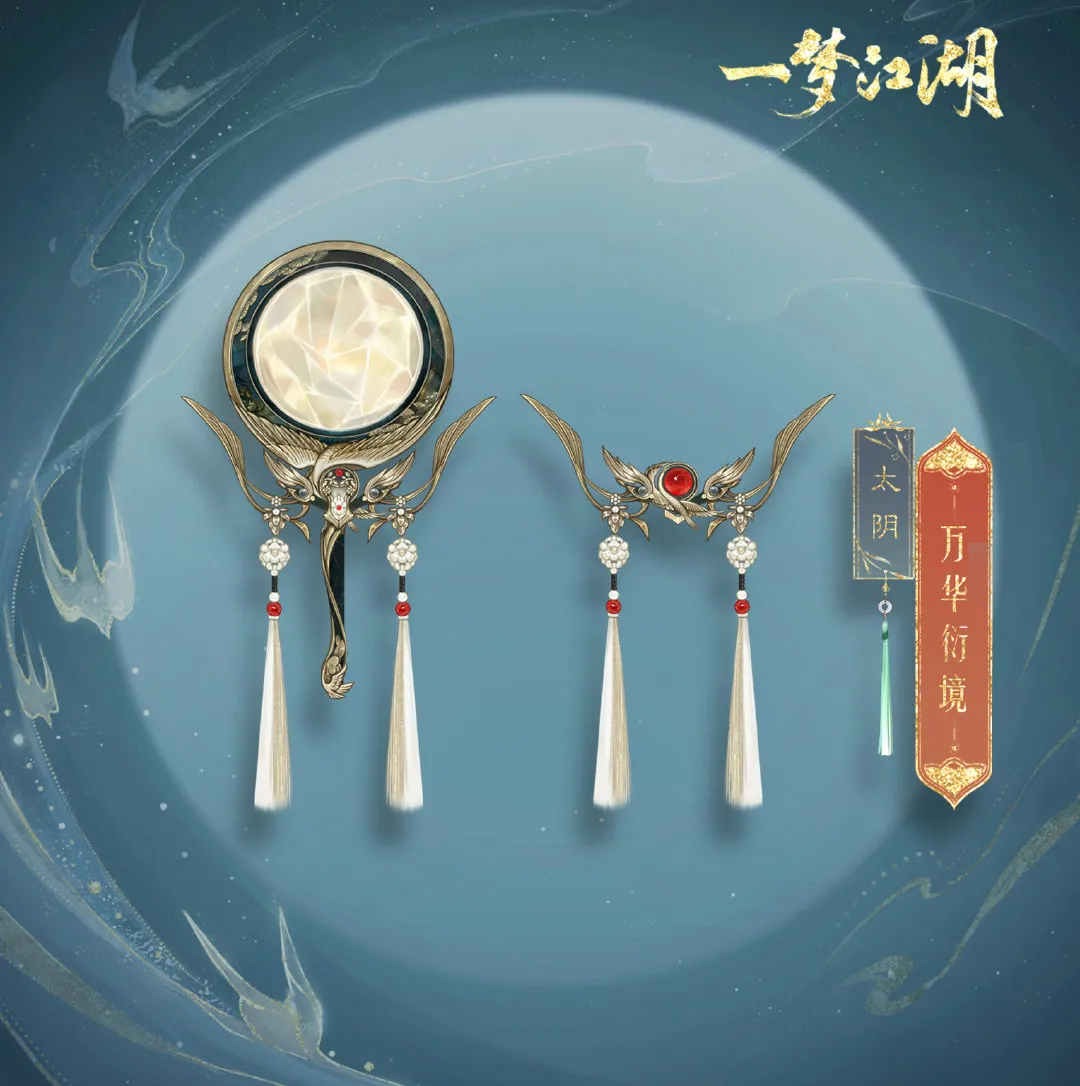 惟妙惟肖的仙鹤在墨绿色的天际展翅高飞,熠熠生辉的钻石化作太阳与月亮镶在万华衍境·镜的背部,体现了太阴门派独有的日月临镜,加上精致的纸雕流苏点缀,宛若一件价值不菲的艺术品。