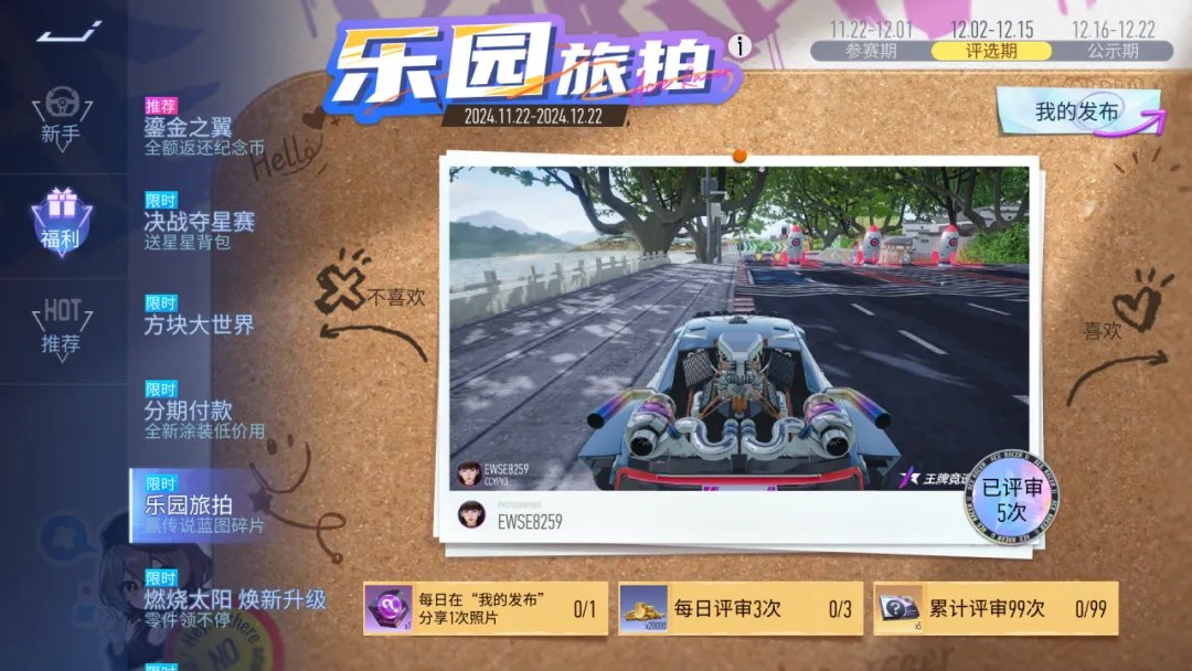 12月16日,第一届乐园旅拍大赛评选结果即将火热出炉~快来看看你的照片有没有获奖,传说蓝图碎片、限时王牌补给券、零件自选包等众多奖励等你抱回家!