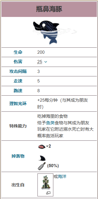 与救生衣类似,当玩家在瓶鼻海豚附近溺水死亡时,瓶鼻海豚会有80%的几率拯救玩家,并将玩家复活在最近的岛上且有足够的原料制作木筏离开岛屿。