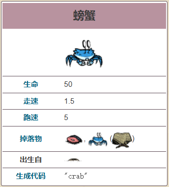 螃蟹是海难DLC中的一种被动生物,与兔子有些相似,但并不会在玩家靠近时躲进巢穴,而是尝试从玩家身边跑开。如果玩家追逐的时间太长,它们会把自己埋进沙子中躲起来。