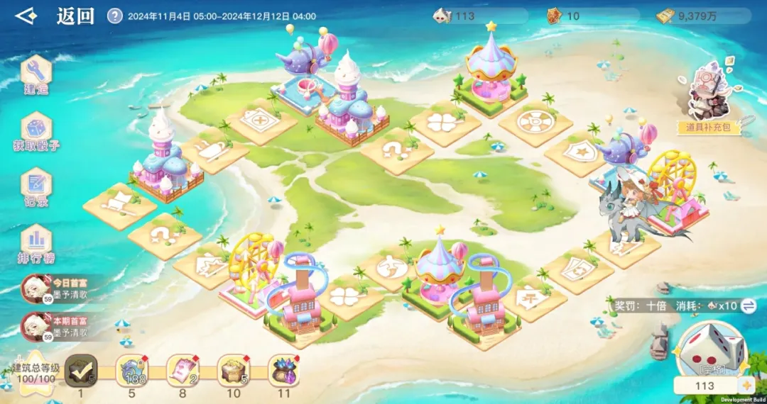 冒险家可以通过完成每日任务、走地图格子、绑玉购买等方式获取骰子,通过掷骰子触发各种机制,从而获取财富券。利用财富券开发荒地,建起各种游乐建筑。最后根据建筑总等级,玩家可以解锁超多奖励,包括限定外观、家园道具、大量藏品、天机券和绑玉!财富券最多的玩家,还能获得永久称号!