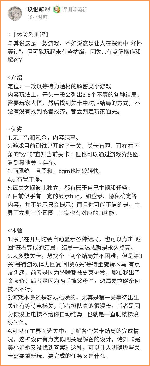 经常会有体验时间不足但是自认为很清晰的感觉,最好的验证办法是自问自答,自己思考游戏体验中对游戏细节有发现什么优缺点,发现多少,发现的是否是其他玩家没有发现的内容?如果以上都实现那说明体验是比较充足的