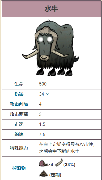 水牛(Water Beefalo)是船难DLC版本的野牛,它们有着与野牛相同的特点,但掉落物是水牛角而不是野牛角,也不会产出野牛毛。它们比普通野牛跑得更快。水牛是红树林的原住民,通常一小群一小群地出现。虽然大部分时间都呆在水里,但它们其实可以在岸上行动。