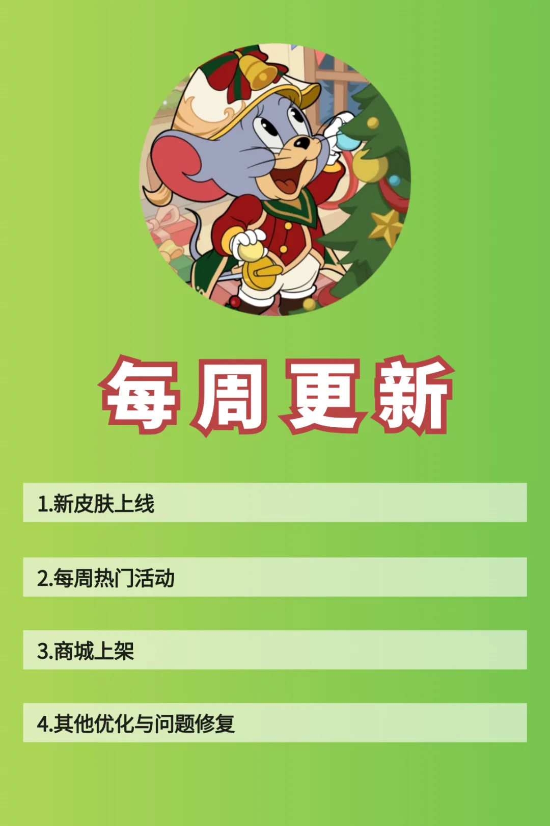以上就是本周(12月12日)更新维护的全部内容啦!感谢小伙伴们对于《猫和老鼠》手游的支持和喜爱,愿欢乐永远陪伴大家左右!