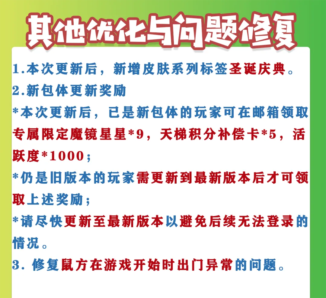 *本次更新后,已是新包体的玩家可在邮箱领取专属限定魔镜星星*9,天梯积分补偿卡*5,活跃度*1000;