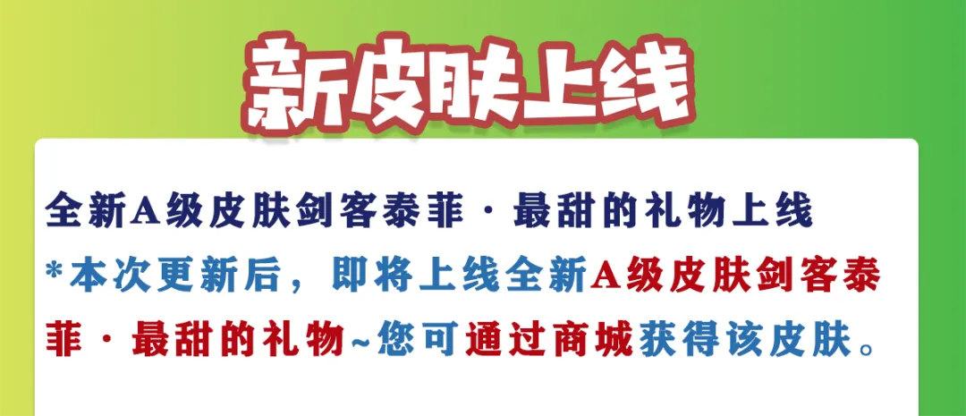 *本次更新后,即将上线全新A级皮肤剑客泰菲·最甜的礼物~您可通过商城获得该皮肤。