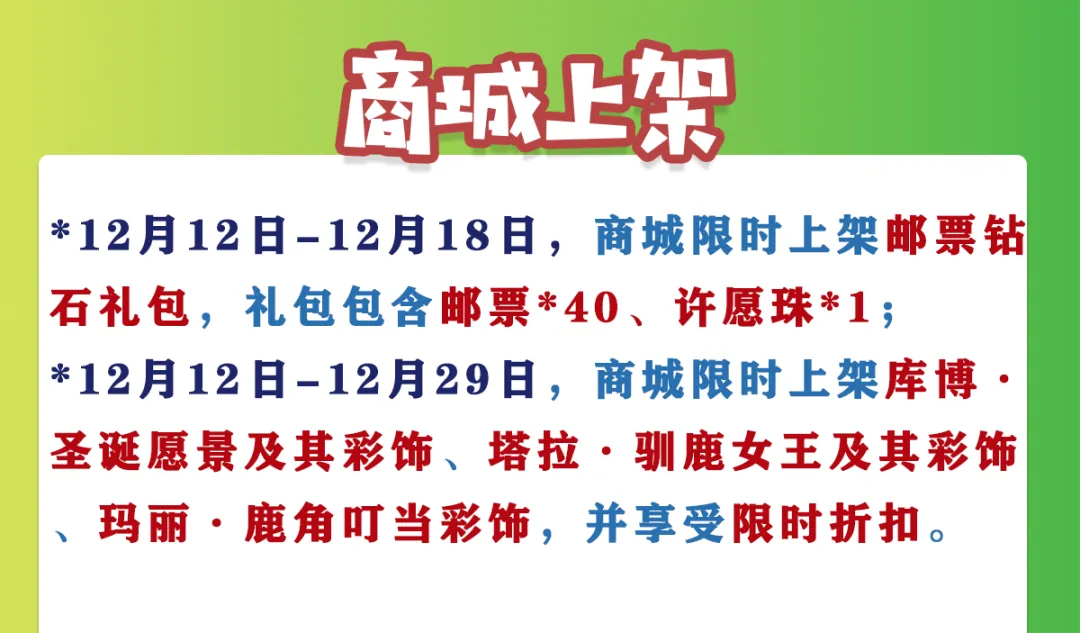 *12月12日-12月18日,商城限时上架邮票钻石礼包,礼包包含邮票*40、许愿珠*1;