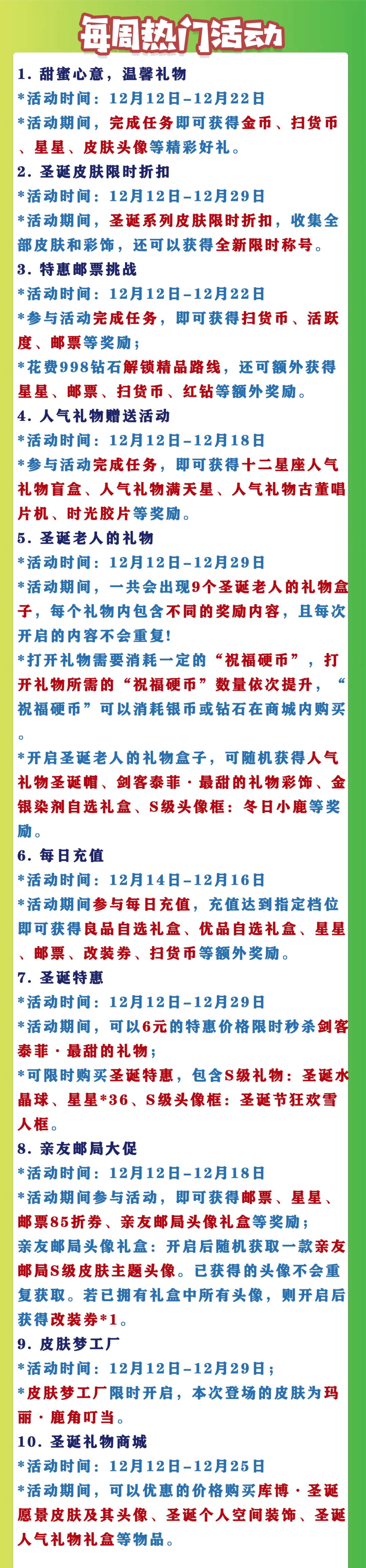 *活动期间,一共会出现9个圣诞老人的礼物盒子,每个礼物内包含不同的奖励内容,且每次开启的内容不会重复!