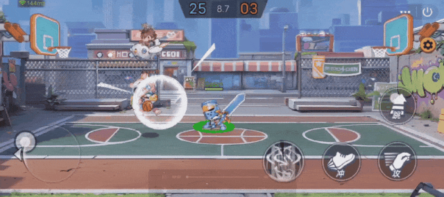 利用骑士可以空中攻击一招击飞人的特性,我们可以在对方扣篮时跳到敌人的位置,朝着敌人空中攻击,可以把敌人扣篮打断,还能把人击飞拿到球。