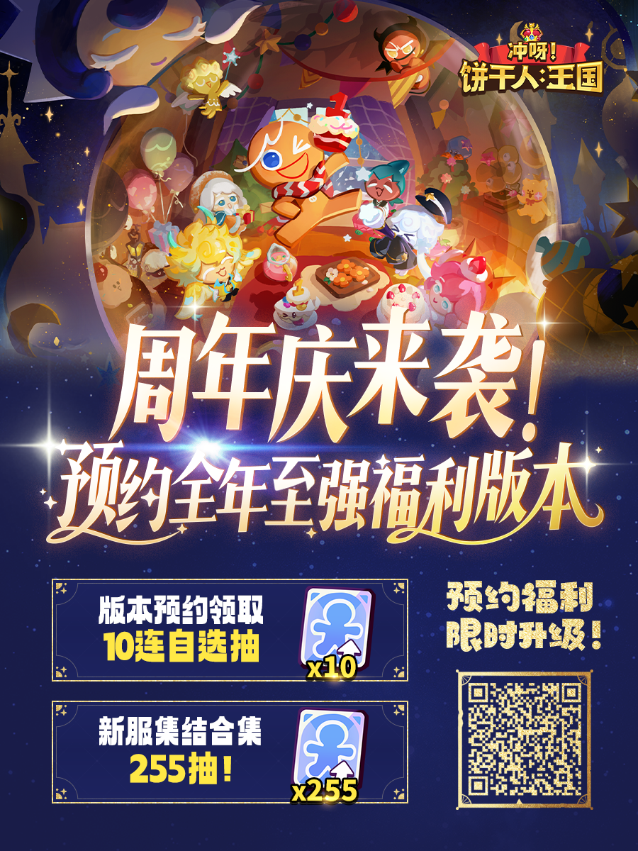 参与新服集结,更可为累积新服角色领取「饼干自选扭蛋模具卡」*245、14日专属buff道具、1576分钟加速券等新服专属成长福利!更多有关周年庆版本的爆料等你来探索,快来参与活动吧~