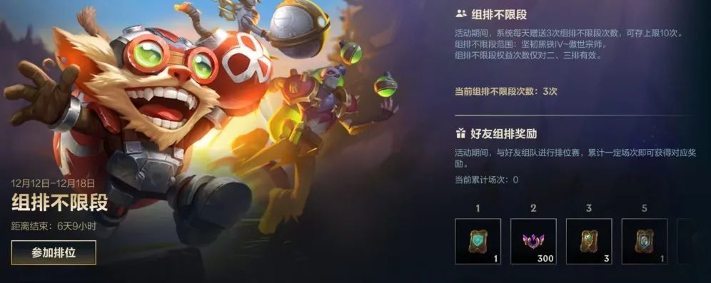 组队打排位赛再也不用担心段位的限制啦!即日起至12月18日活动期间,召唤师每日享有3场组排不限段次数,累计可存10次上限。累计组排场次达到相应次数,还可领取对应的微型海克斯能量卡、排位币、限定活动称号-最佳搭档、海克斯能量卡等奖励~