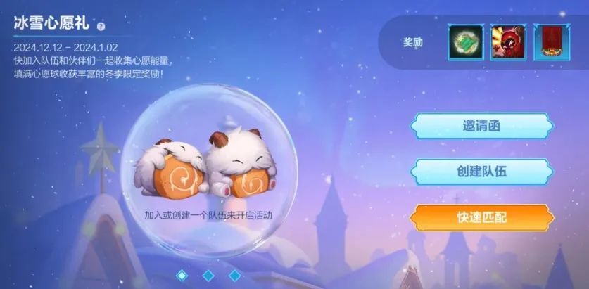 即日起至1月2日,召唤师可加入或创建一个队伍来开启活动,通过参与游戏对局和队伍成员们一起收集心愿能量填满心愿球,就有机会获得出生印记-圣诞快乐、头像-是!哥们!和无畏队旗-狂欢队旗等冬季限定奖励~