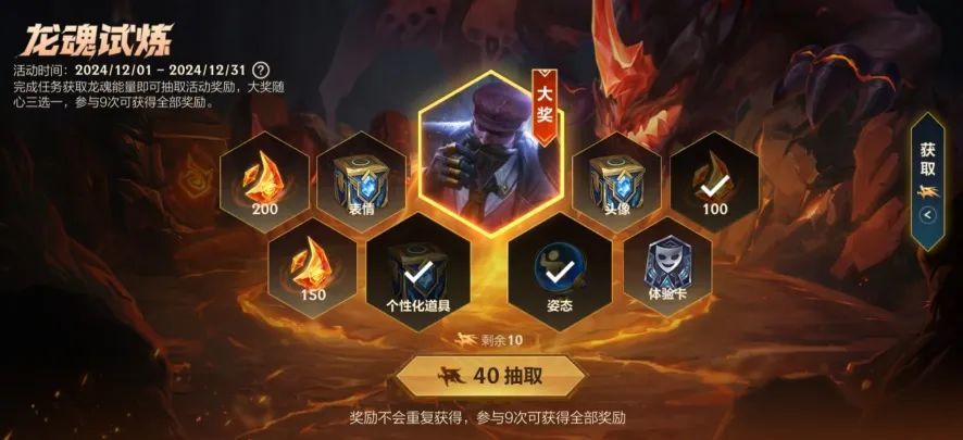 龙魂试炼阶段二火热进行中!截止至12月31日,召唤师完成对应阶段的任务,即可实现末路教父 格雷福斯、龙魂水晶*3000和专属大奖随心三选一!