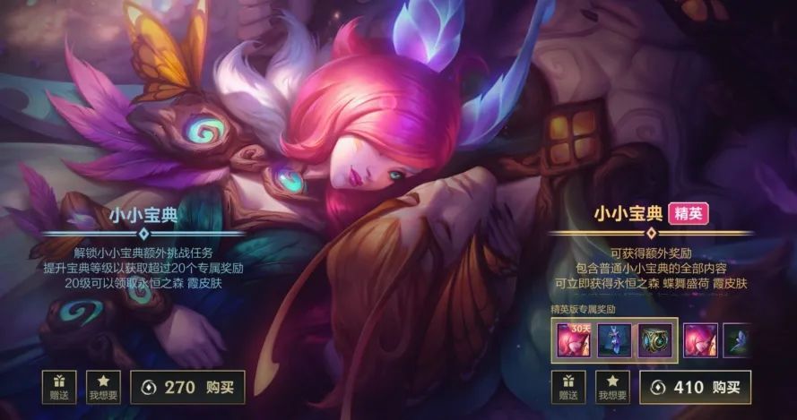 召唤师也可选择购买小小宝典,普通版小小宝典需花费270点券,精英版小小宝典则需花费410点券,不仅包含普通版小小宝典的全部内容,还可立即获得炫彩皮肤:永恒之森 蝶舞盛荷 霞!