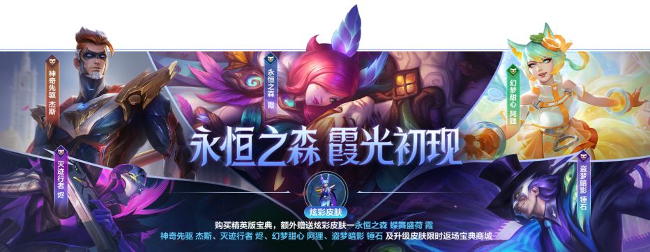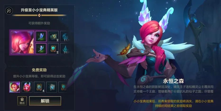 全新小小宝典皮肤永恒之森 霞已随新小小宝典亮相!选择精英版小小宝典,还将额外赠送炫彩皮肤:永恒之森 蝶舞盛荷 霞。