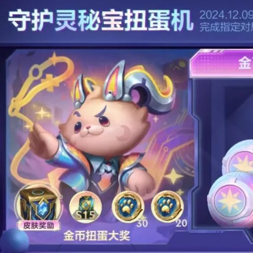 消耗秘宝金币、秘宝银币在守护灵秘宝扭蛋机进行扭蛋,即可获得精选分路皮肤宝箱、S15海克斯护盾卡等奖励。