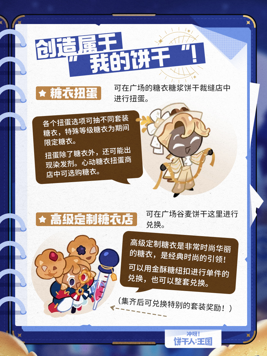 管理了饼干人王国这么久,饼干朋友自己也终于有了实实在在的饼干人面貌!可以依照自己的兴趣和喜好,打造自己喜欢的饼干形象,不管是发型、还是糖衣穿着,甚至是眉眼表情,都可以随心搭配~