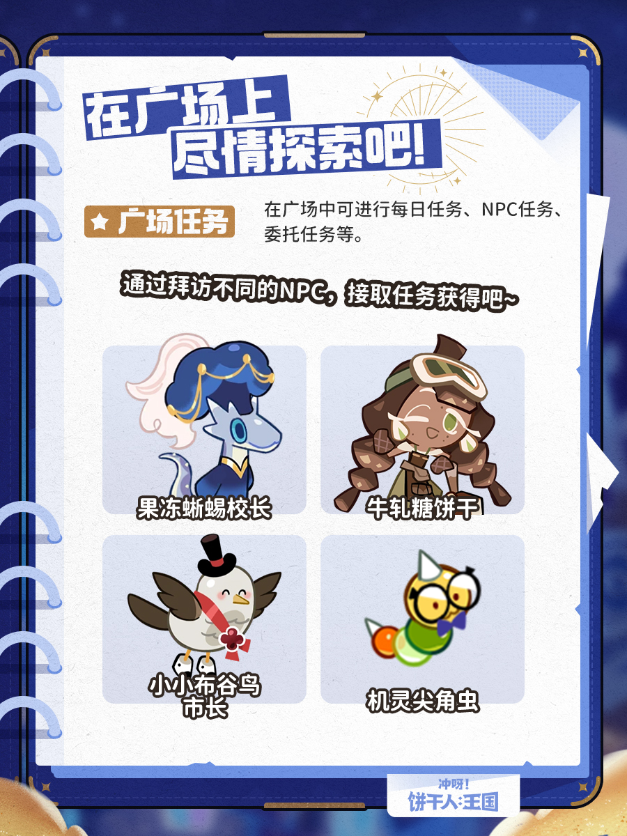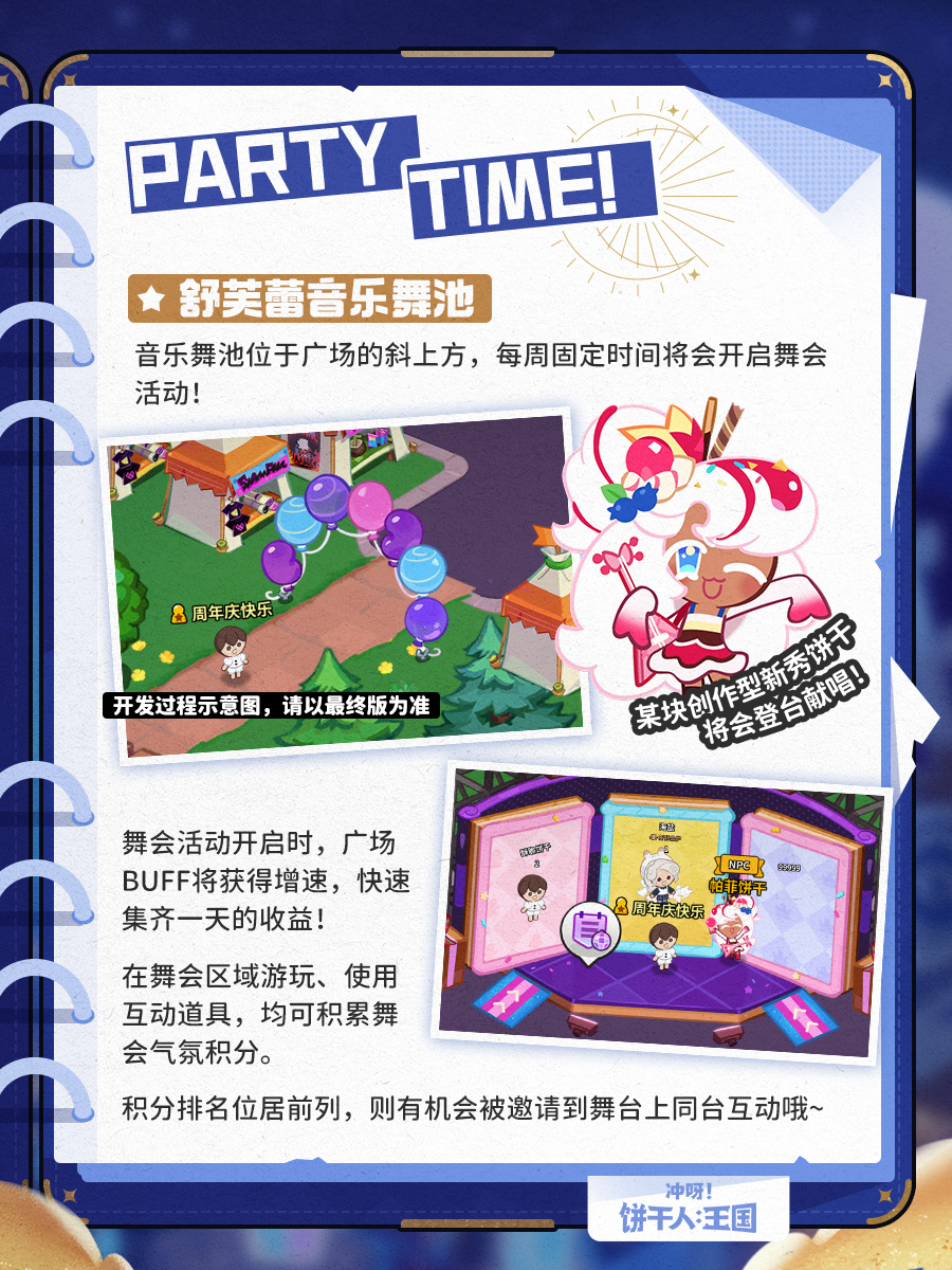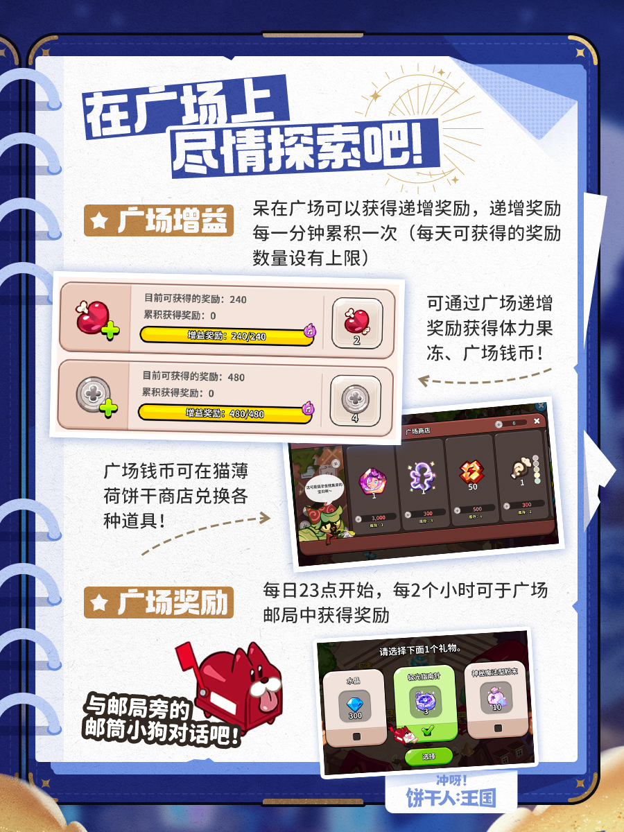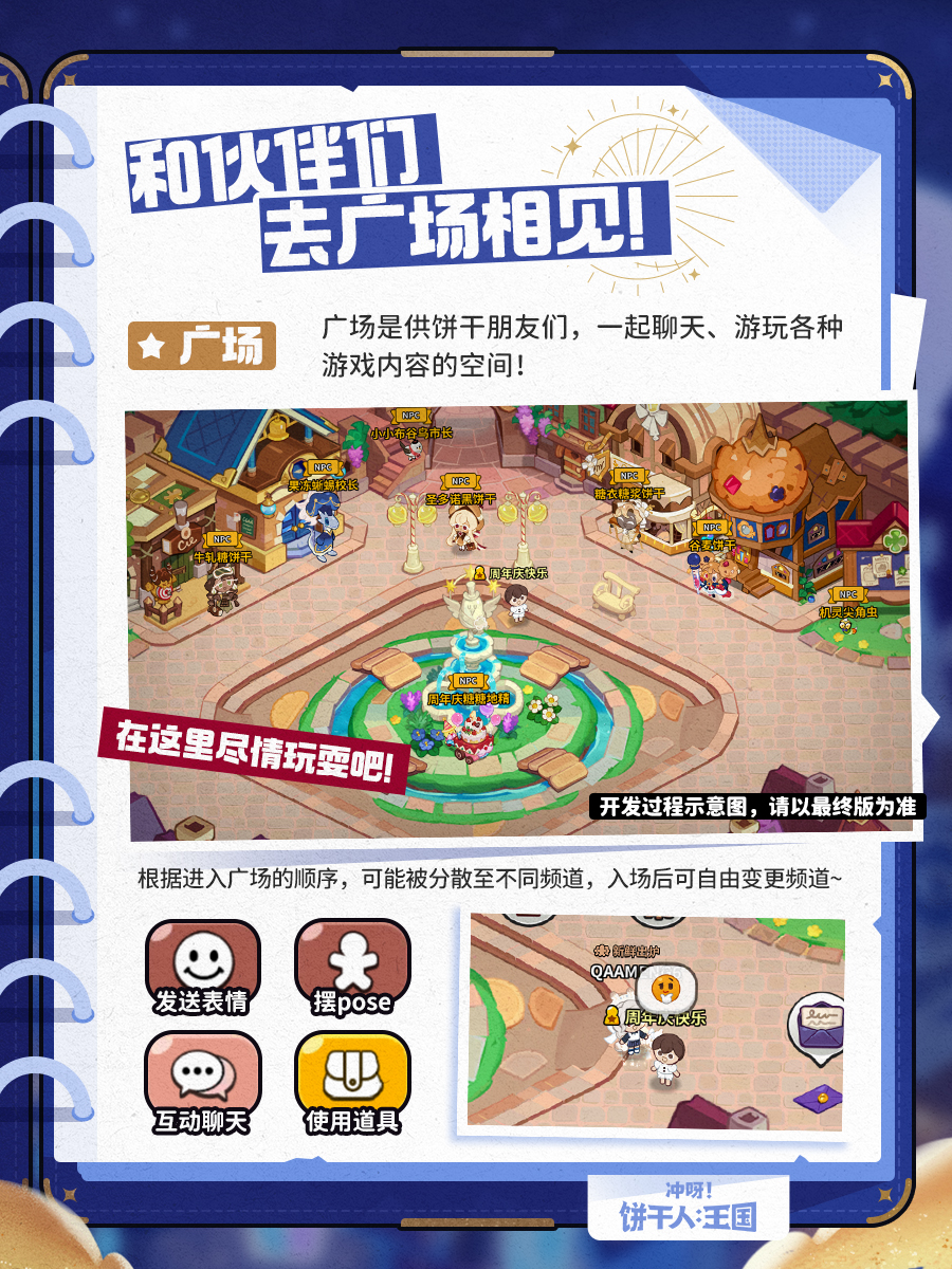 在拥有“我的饼干”后,可以和伙伴们一同进入广场玩耍,今后终于可以和伙伴们在广场上相见!广场上有各种彩蛋任务,听说每周还将开放特殊的舞会活动,一起打扮得香香甜甜出街吧~