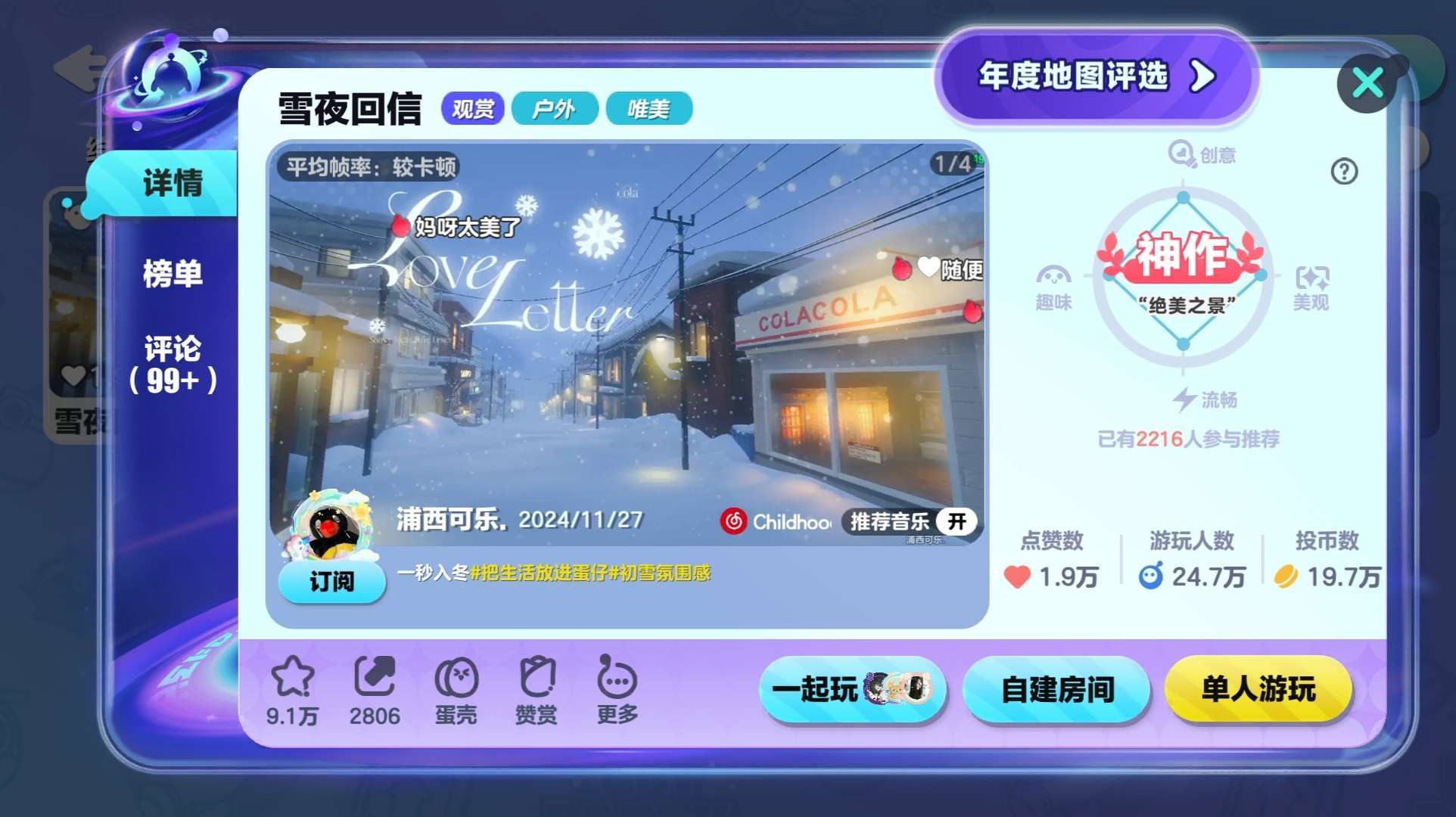 封面上就可以看的出来这张图做的细心精致,耗时想必也不少,就是有这些作者愿意花时间来创作蛋仔才会有这么多好看唯美氛围感强的地图。(弹幕也是好多蛋宝们对老师的赞赏)