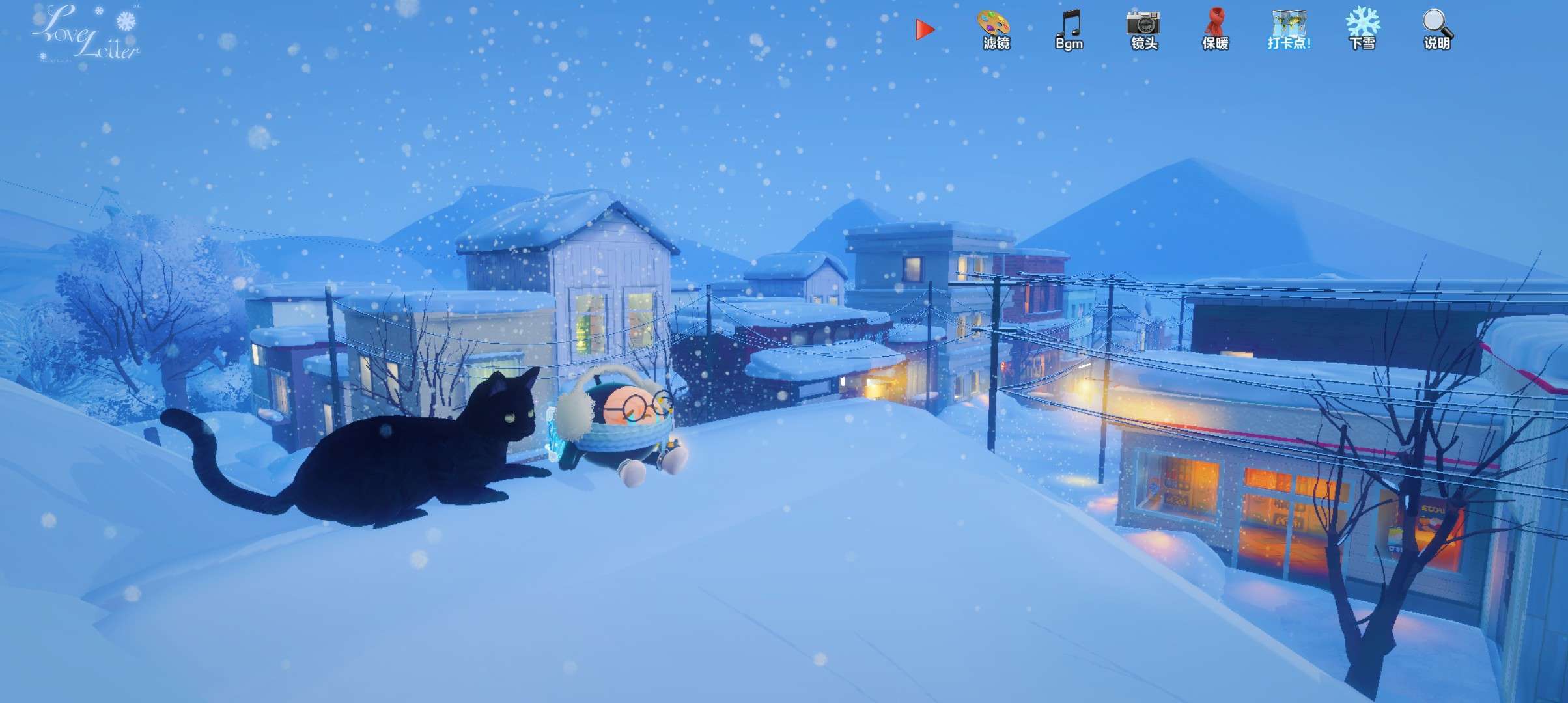 空中还有飘落的雪花,远处的山与雪颜色有区分开,视觉上能明显看到山和雪地。[也有把屋顶上的白雪花细节捏出来]☁