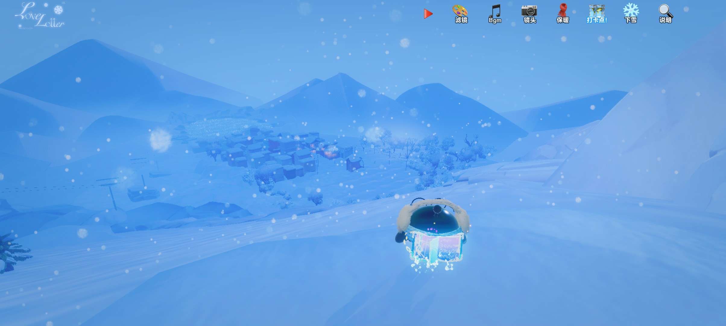 而右上角也有很多功能可以调节,有滤镜、下雪开关、自由选择BGM、镜头与蛋仔的距离和作者怕我们的蛋仔会冷准备的围巾等装饰!