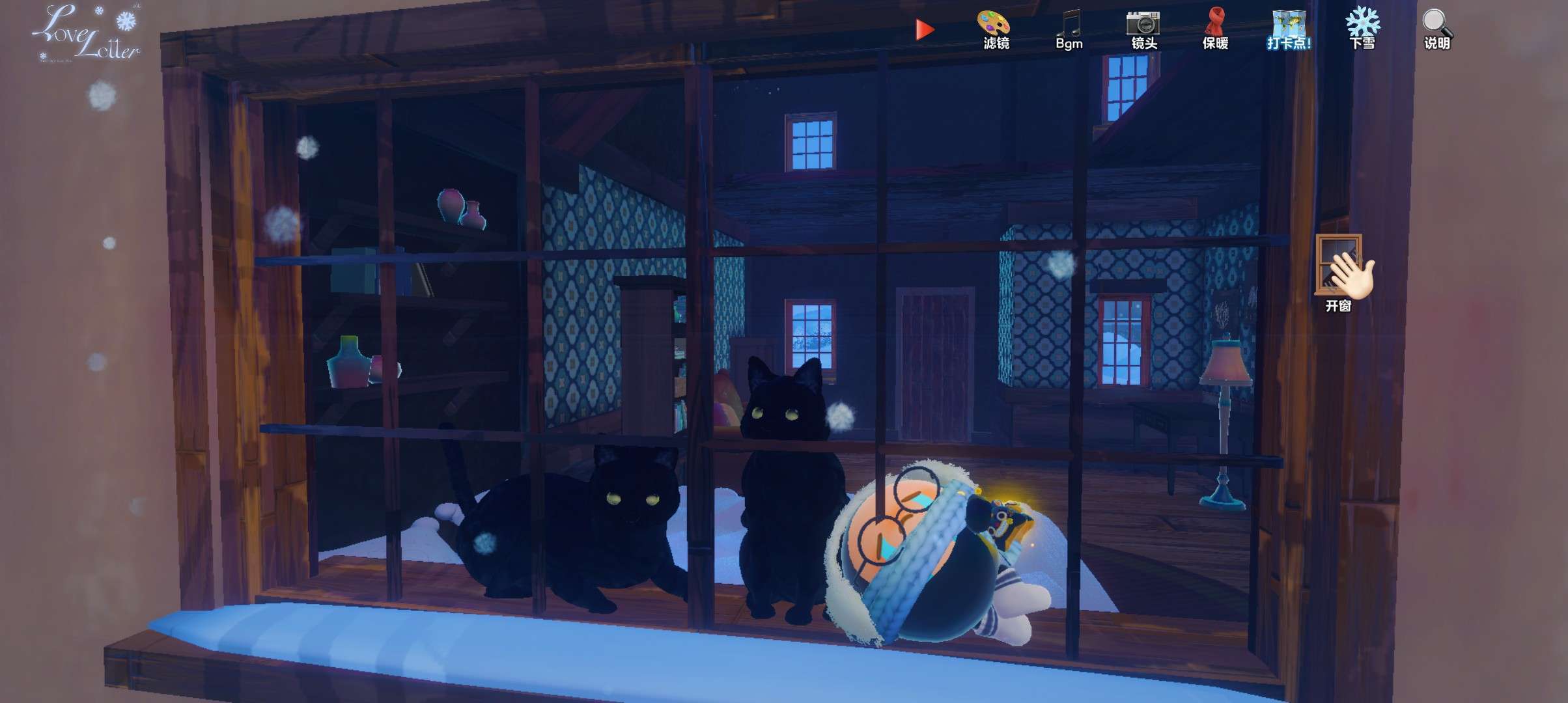 最后一个打卡点是小屋,小屋主色偏红木色,床在窗户前,窗户上有两只黑猫,窗户还可以打开,这里可以让小蛋仔坐在黑猫的旁边,小屋也是很精致真实的。