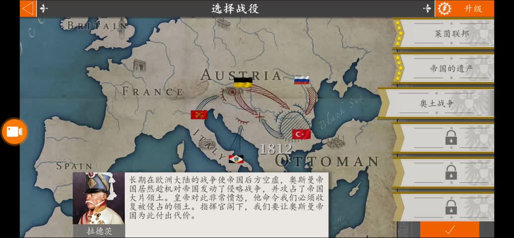 这是《欧陆战争4:拿破仑》的“盟9 普鲁士的怒火”关卡内容,展示了指挥部的将领索菲娅、内内杜维奇、苏尔科沃斯基,还有该关卡的多阶段战斗场景,呈现了不同区域的作战部署与战况。