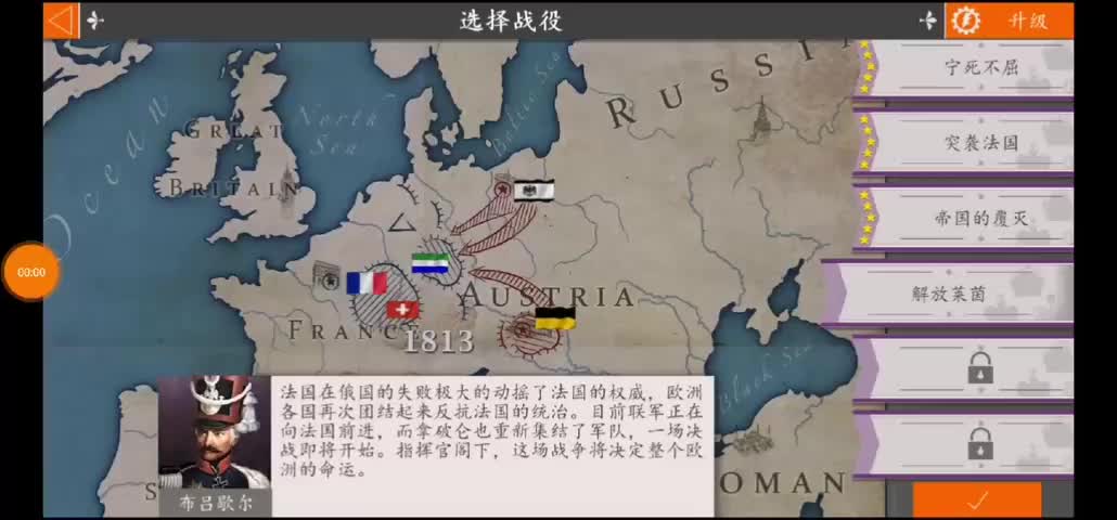 这是游戏《神罗4》里的吕岑战役内容,背景设定在1813年,此时法军经俄法大战元气大伤,俄普联军向法国挺进,玩家将指挥军队对战法军,图中展示了该战役的背景介绍与多场战斗界面。