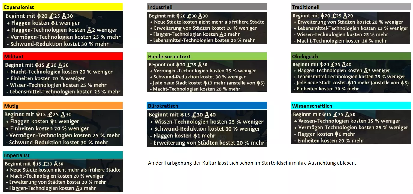 所有卡牌一览,包含文明的起始位置。 地图概览,显示文明的起始位置。 不同文明的加成与劣势 / 文明的优缺点