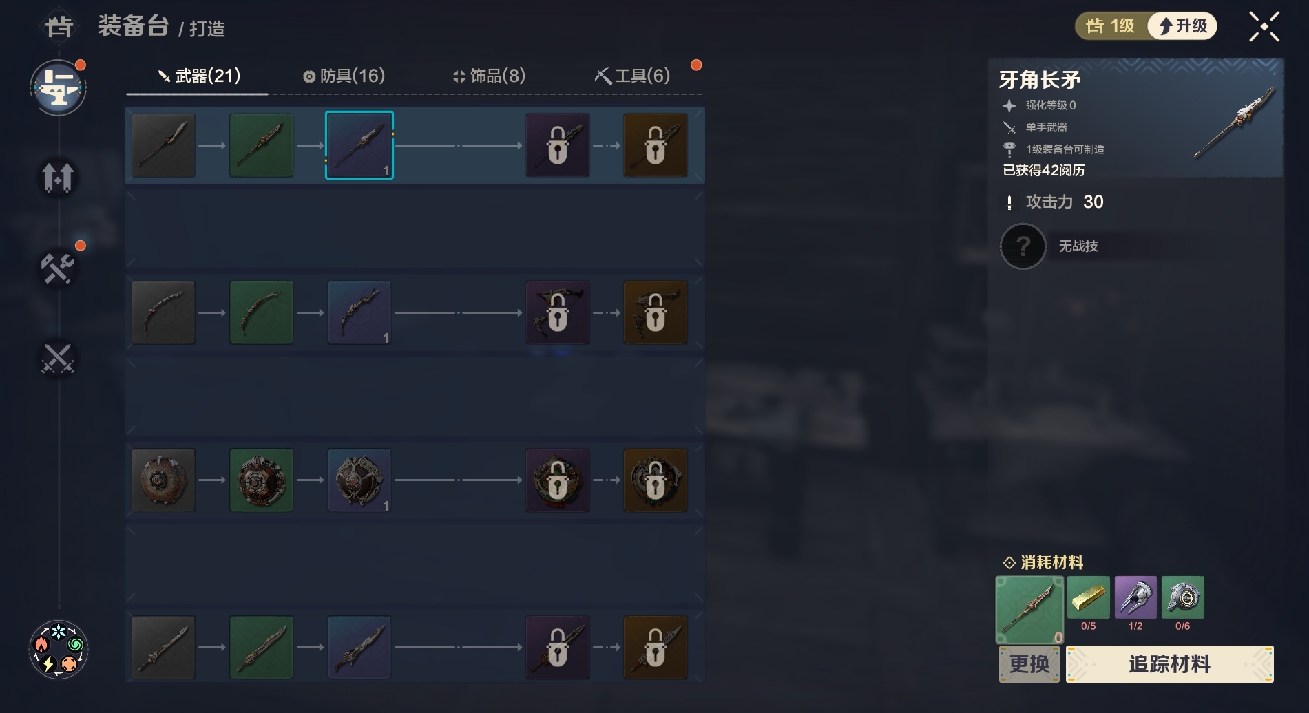 游戏中所有的武器防具都可以通过装备台制造出来。装备品质从低到高分为:白<绿<蓝<紫<橙,想要制造装备需要先在配方中解锁该装备,随后就可以在所需等级装备台中消耗材料将其造出。