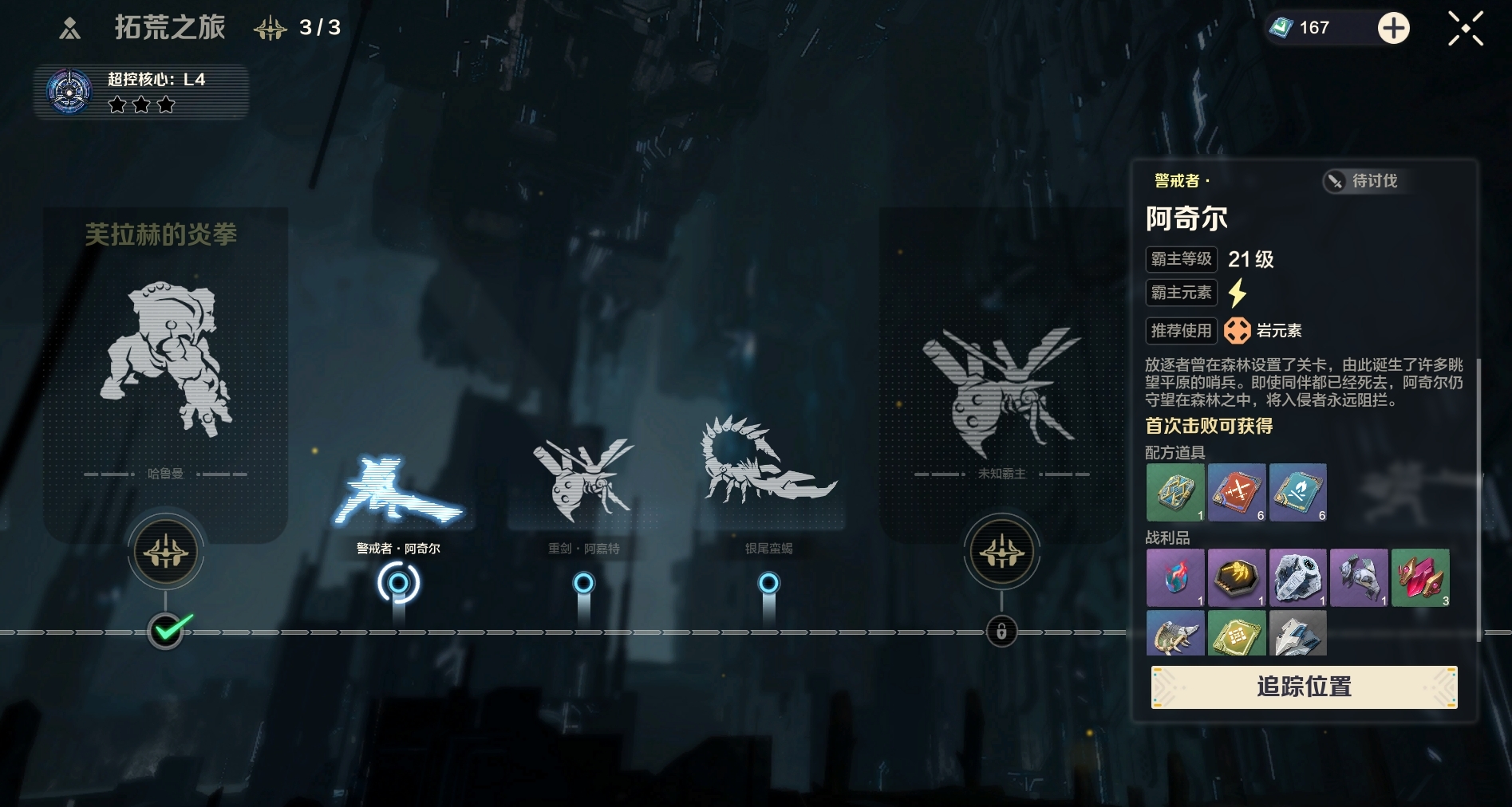 击败霸主后除了常规的材料,有些霸主还会掉落火、电、冰、风、岩等不同属性的战技。我们可以在自己喜欢的武器中装配对应的战技,面对不同的敌人利用属性克制关系打出更高的伤害。此外随着核心等级的提升,还会解锁回路与古珀等功能,这些功能都可以进一步的提升拓荒者的战斗能力。