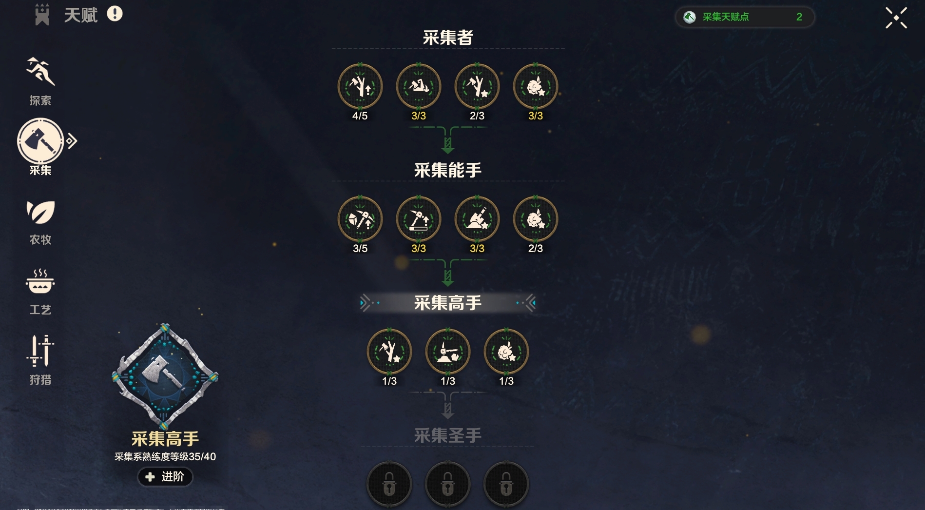 除此之外游戏中还有天赋系统,天赋可以全方位的提高日常游戏效率。天赋分为探索、采集、农牧、工艺及狩猎五种。不同天赋对应不同天赋点,天赋点会在各种动作中产生,如打怪,奔跑,游泳,伐木,种植等动作中获得,天赋点可以用于各类子天赋升级。当条件达到后,更是可以将天赋进阶,解锁全新的子天赋。让大家在诸多方面都可以事半功倍。