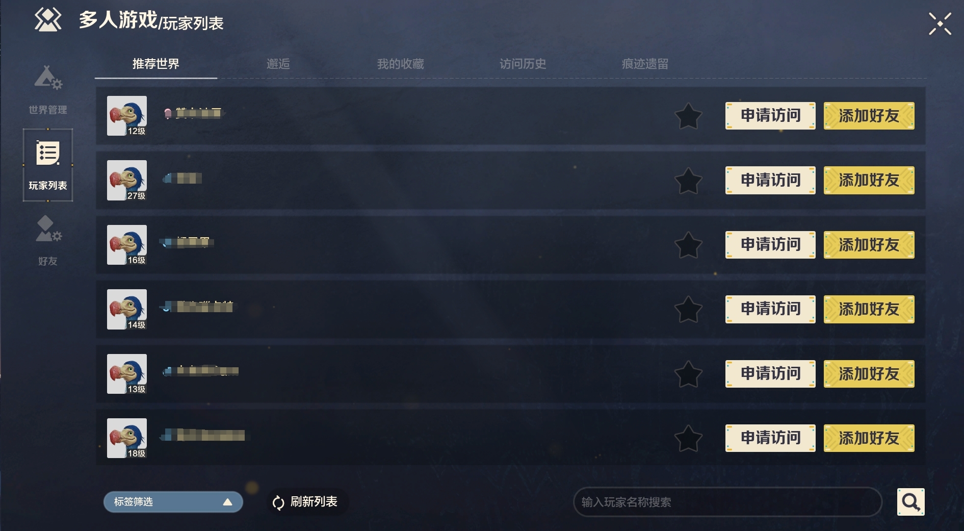 和好朋友一起在《荒野起源》中玩耍当然也是必不可少的,游戏中我们可以在菜单页面里的多人游戏来进行好友联机玩法。在这里不仅可以申请访问好友的世界,更是有许多推荐世界可以进去交朋友。