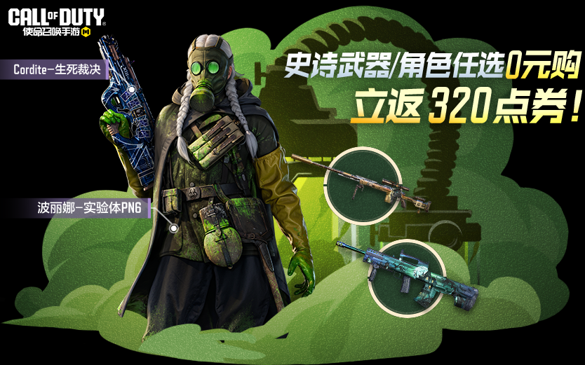 战士们花费30软妹币购买立得7天武器角色任选宝箱与320COD点券,且在第二周登录游戏时,可从史诗角色波丽娜-实验体PN6、史诗级武器Cordite-生死裁决、返场武器DLQ33-黑色雄狮与Oden-神秘古堡任选其一!