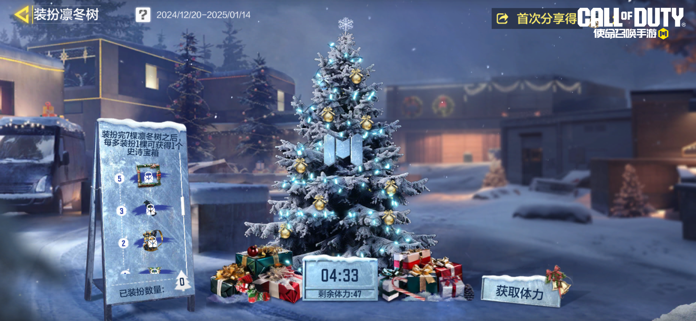 ● 【装扮凛冬树】正式上线,完成任务获得体力,装扮凛冬树,即可获得史诗级武器PP19-冬境御雪;