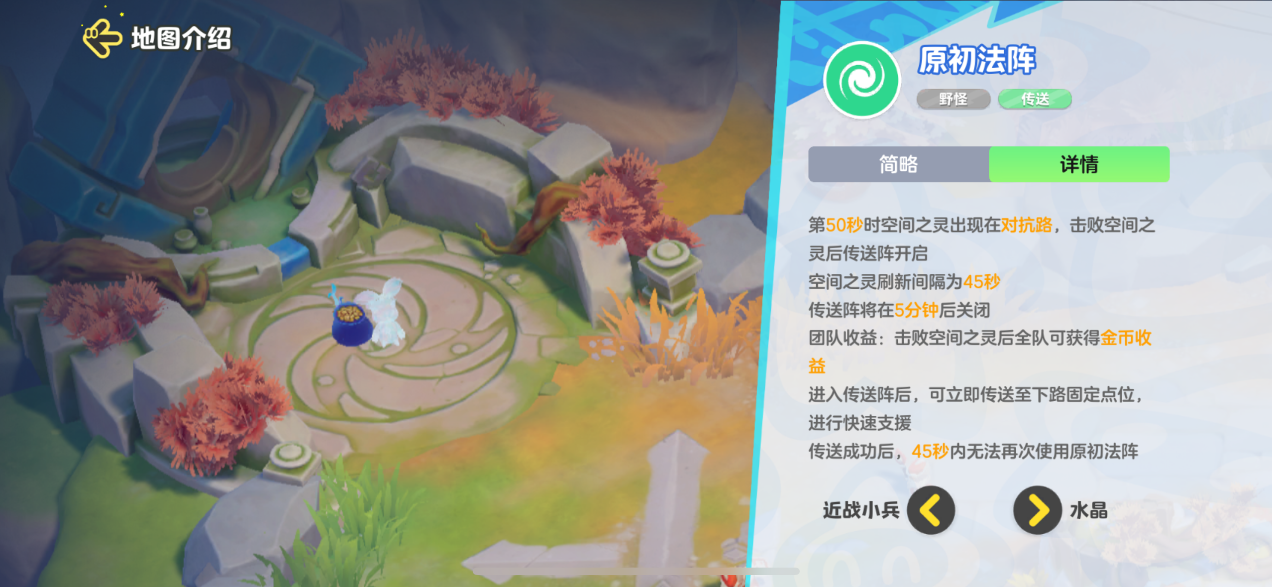 在对抗路,开局50秒后将会刷新原初法阵,星宝们击败空间之灵,不仅可以全队获得额外金币,还能开启传送法阵,这样就能快速前往发育路支援啦!