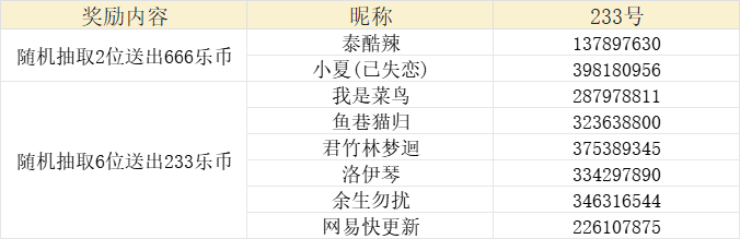 随机抽取6位玩家送出233乐币